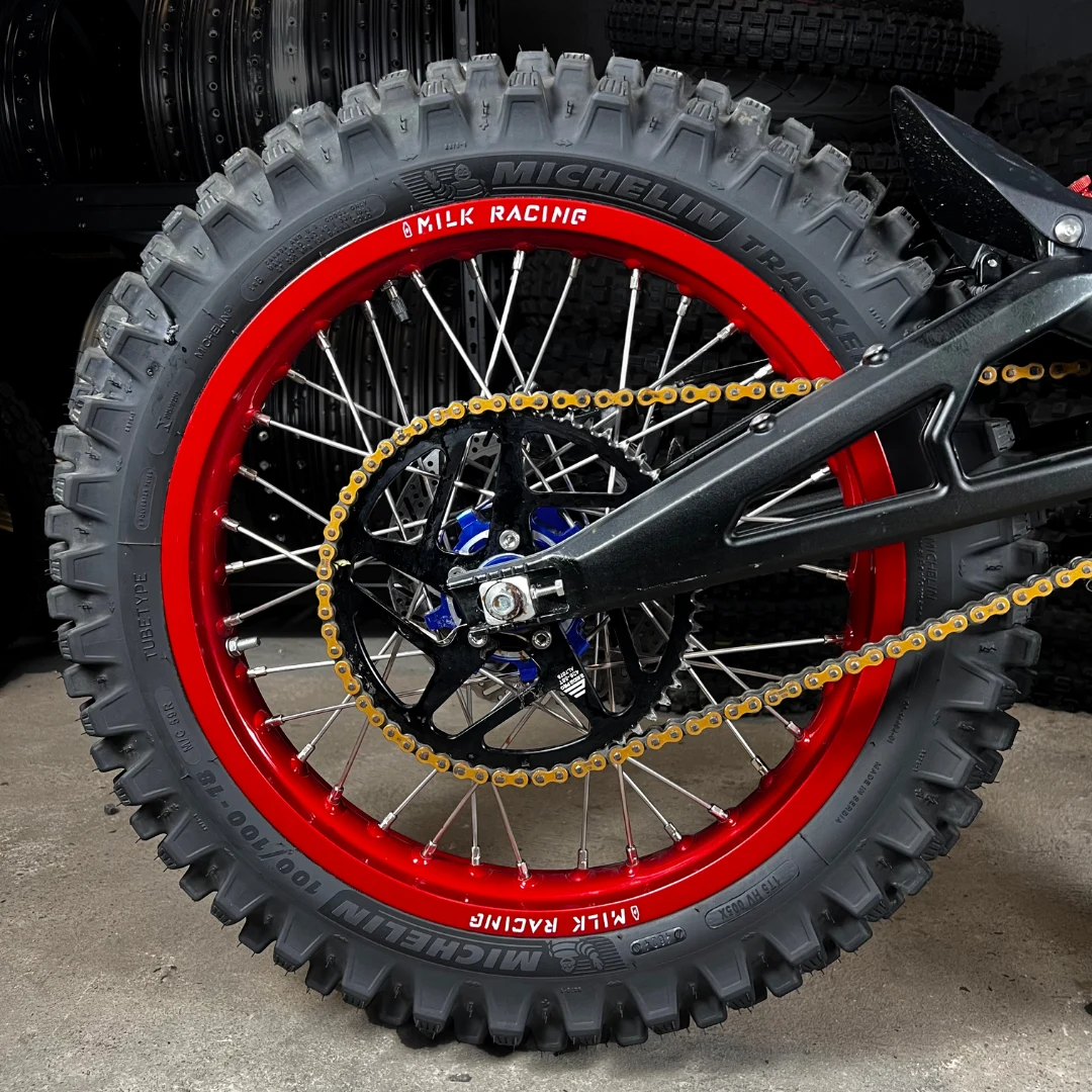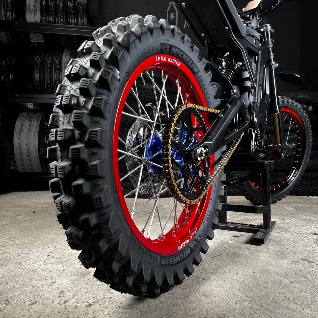 Made in-house by hand, sold worldwide, and test-proven by thousands of customers on six continents – the best quality/price wheels on the market. Upgraded, reinforced rims stained with an anodizing process give them a more scratch and corrosion-resistant surface than standard paint. Super strong upgraded stainless steel spokes and double-size brass nipples (more robust and more corrosion resistant than aluminum type) lanced with a 3-cross spoke pattern make Milk Racing wheels strong enough to withstand more than what Sur-Ron or Talaria bike can stand.
